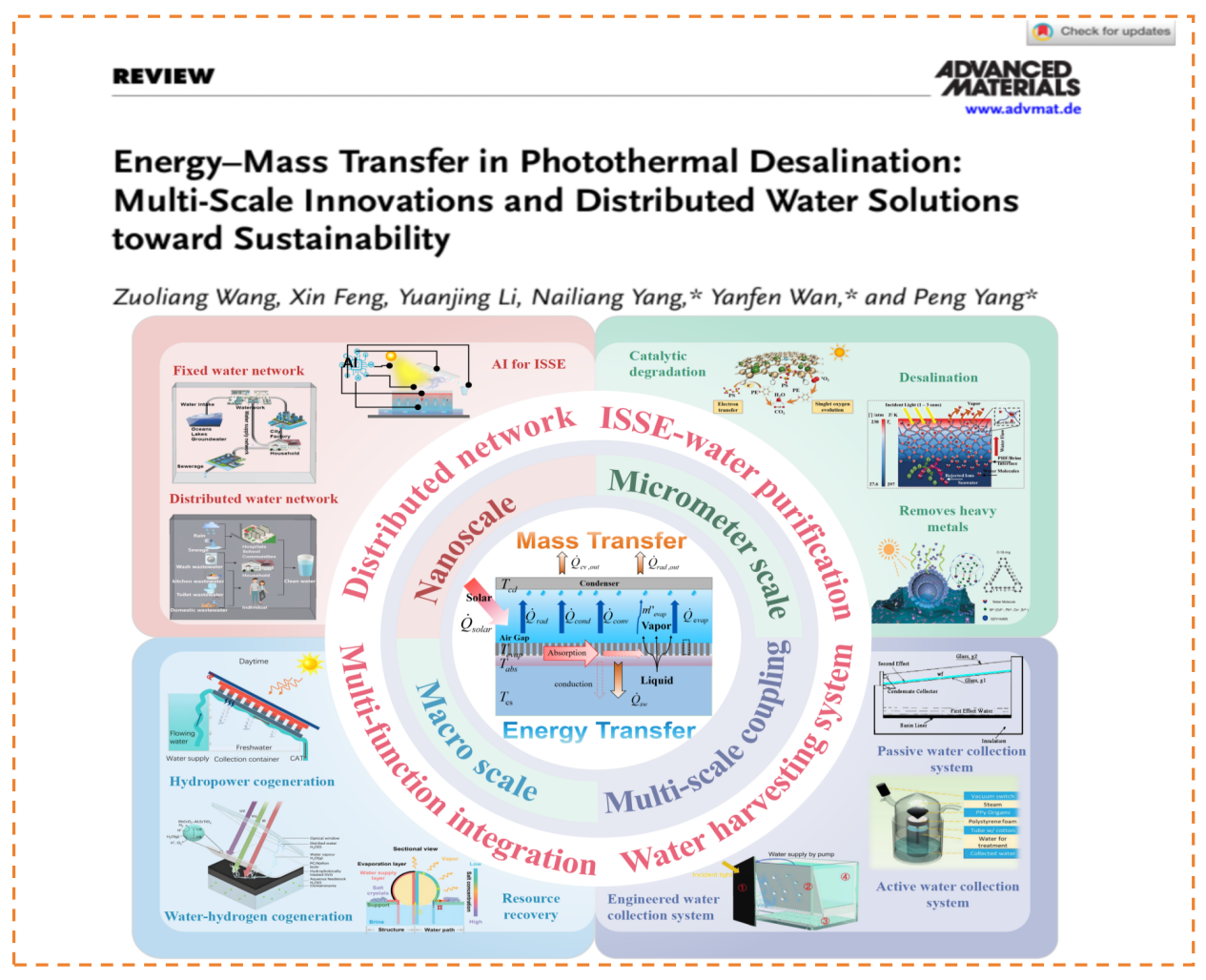 近日,bevitor伟德国际1946和国际河流与生态安全研究院王作亮博士、万艳芬教授团队在材料科学领域知名期刊Advanced Materials(影响因子26.8)上发表综述论文“Energy–Mass Transfer in Photothermal Desalination:Multi‐Scale Innovations and Distributed Water Solutions toward Sustainability”(论文链接:https://doi.org/10.1002/adma.202510796)